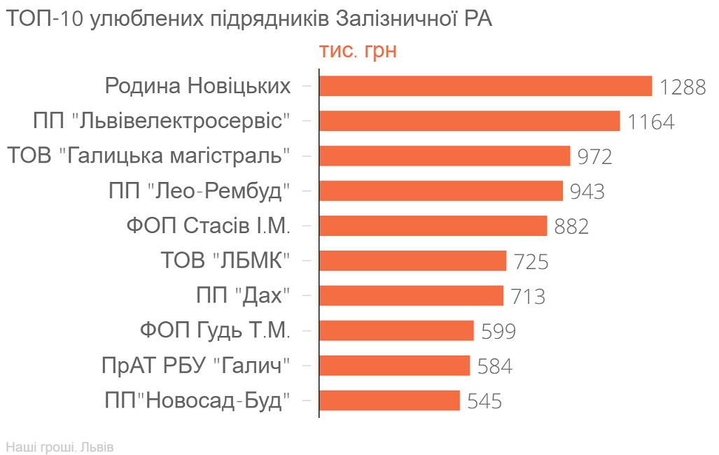 Перше місце за сумою отриманих бюджетних коштів на ремонт житлового фонду посіла родина підприємців Новіцьких. Вони отримали підрядів на загальну суму 1,28 млн грн. З них, приватні підприємці Іван та Роман Новіцькі відремонтували 11 будинків у районі на 924,82 тис. грн. Решту коштів освоїло ПП «Буд-Бізнес-Ром», що належить Роману Новіцькому та ПП “Мета”, що належить Ірині Новіцький.
