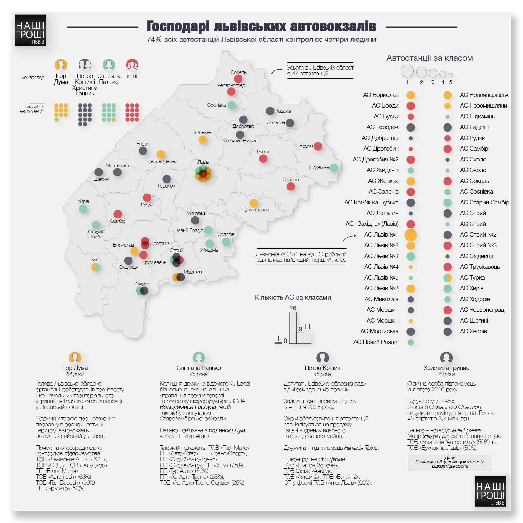 Загалом у Львові та області функціонує 47 автостанцій. 35 з них, тобто 74%, станом на серпень 2016 року контролюються Ігорем Думою, Світланою Палько та Петром Кошиком на пару з вчорашньою студенткою Христиною Гриник.
