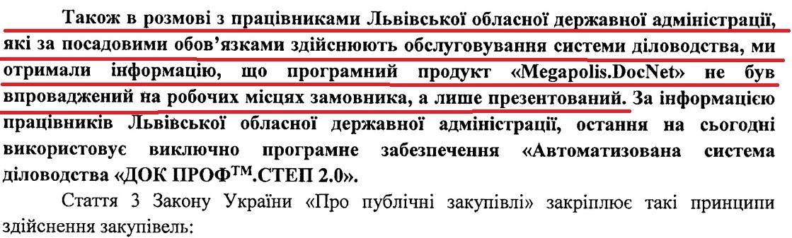 Так як програма вже стоїть «на основних робочих місцях», «залучення іншого виконавця чи зміна програмного продукту призведе до додаткових витрат на обстеження процесів діловодства та повторного впровадження програмних рішень на вже автоматизованих робочих місцях», – йдеться далі в обгрунтуванні закупівлі.