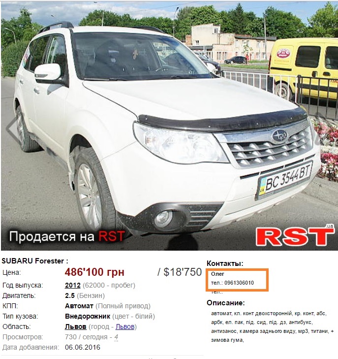 У червні цього року людина на ім’я Олег з мобільним телефоном, що повністю відповідає контактному ПП «Біолбуд», продавала білий Субару Форестер 2012 року випуску за 486 тис. грн.