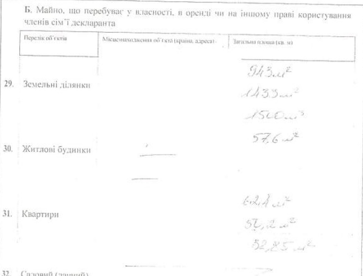 Дві найбільші ділянки, площею 1500 і 1433 кв. м, та будинок (57,6 кв. м) знаходяться у селі Новосілка Івано-Франківської області. Точне місце розташування цих ділянок невідоме, оскільки в реєстрі нерухомості даних про них немає.