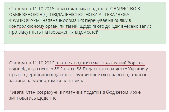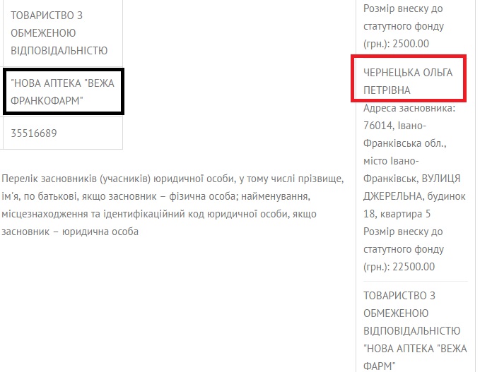 Внесок Ольги Чернецької до статутного капіталу фірми становить 22,5 тис. грн. «Нова аптека «Вежа Франкофарм» не перебуває в стані припинення діяльності, вказано в реєстрі. Однак станом на 11 жовтня фірма має податковий борг та перебуває на обліку в контролюючому органі як така, щодо якої до реєстру внесено запис про відсутність підтвердження відомостей.