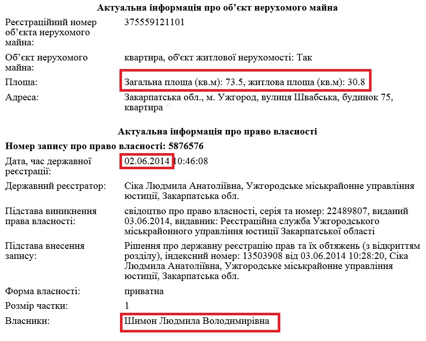 У 2014 році дружина прокурора Людмила також придбала квартиру в Ужгороді на вул. Швабській, площею 73,5 кв. м. Житло приблизно з такою ж площею у даному будинку продається за 1,56 млн грн.