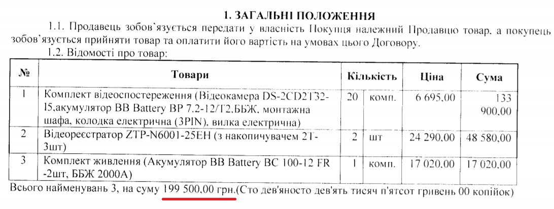 Згідно з інформацією в договорі, придбають 20 комплектів відеоспостереження по 6695 грн кожен. У комплект входить відеокамера, акумулятор, монтажна шафа, електрична колодка та вилка. В інтернет-магазинах такі камери коштують 3510 грн. Ціни на решту складників комплекту дуже сильно відрізняються.