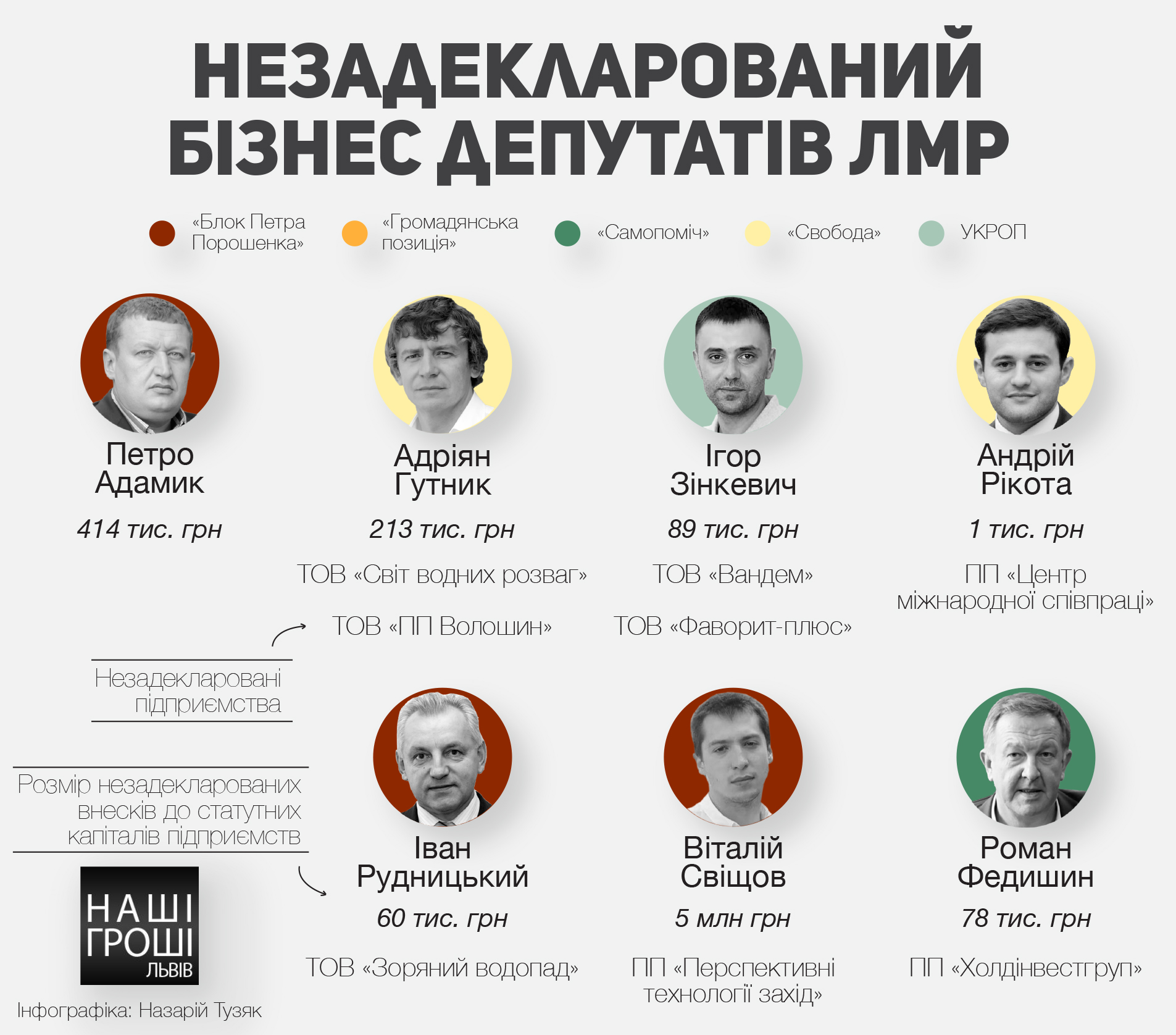 Найбільшими деклараційними тіньовиками виявились Григорій Козловський (БПП), Ірина Сердюк (Громадянська позиція) та Ігор Корончевський (Самопоміч). Ця трійка не задекларувала жодного внеску до статутних фондів власних фірм, хоча кожен з них давно і активно веде господарську діяльність, а суми цих внесків сягають мільйонів гривень.