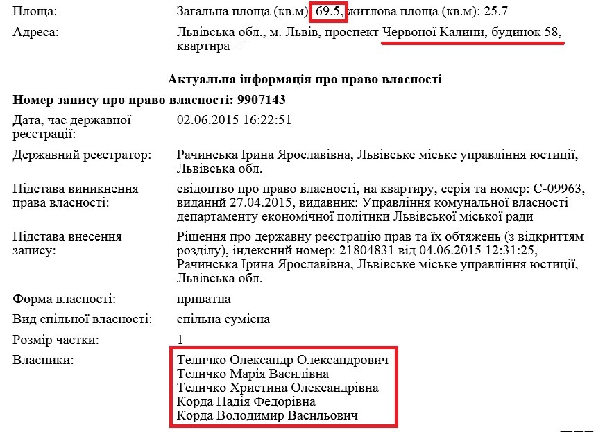 А сам прокурор приватизував квартиру на проспекті Червоної Калини, 58, площею 69,5 кв. м, яка згідно з реєстром нерухомості, записана не лише на нього, доньку та дружина, а й на родичів дружини.