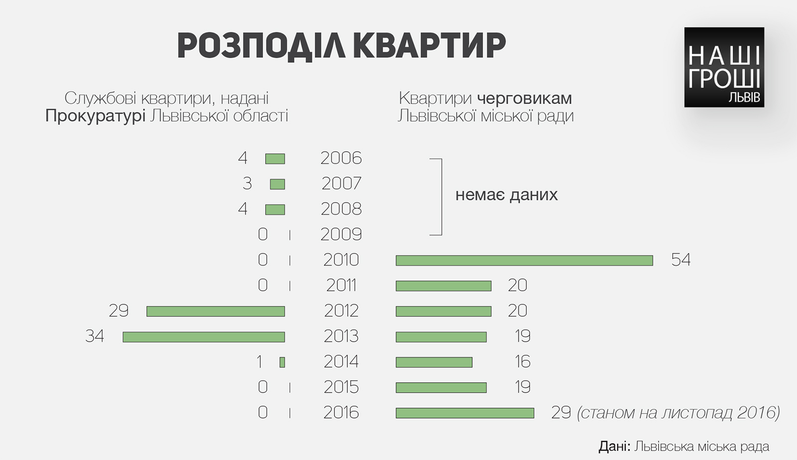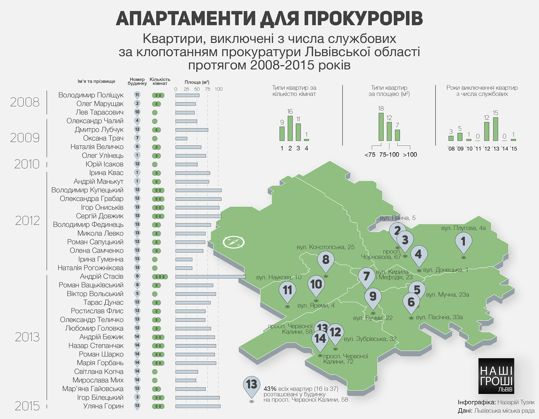 «Наші гроші. Львів» спеціально для львівської мерії та прокуратури перевірили всіх, хто приватизував квартири. Ми не обурюємось, – просто констатуємо, що майновий стан деяких прокурорів, які безкоштовно отримали житло, дозволяє їм самостійно виступати спонсорами для купівлі квартир колегам.