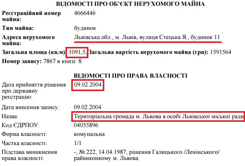 Таким чином приміщення на вул. Півколо, 14 (375.7 кв. м), вул. Січових Стрільців, 3 (157,9 кв. м), вул. Ярослава Стецька, 11 (339,3 кв. м) та вул. Свєнціцького, 7 (382,6 кв. м) з’явились в електронному реєстрі як власність уродженця Лисичанська.