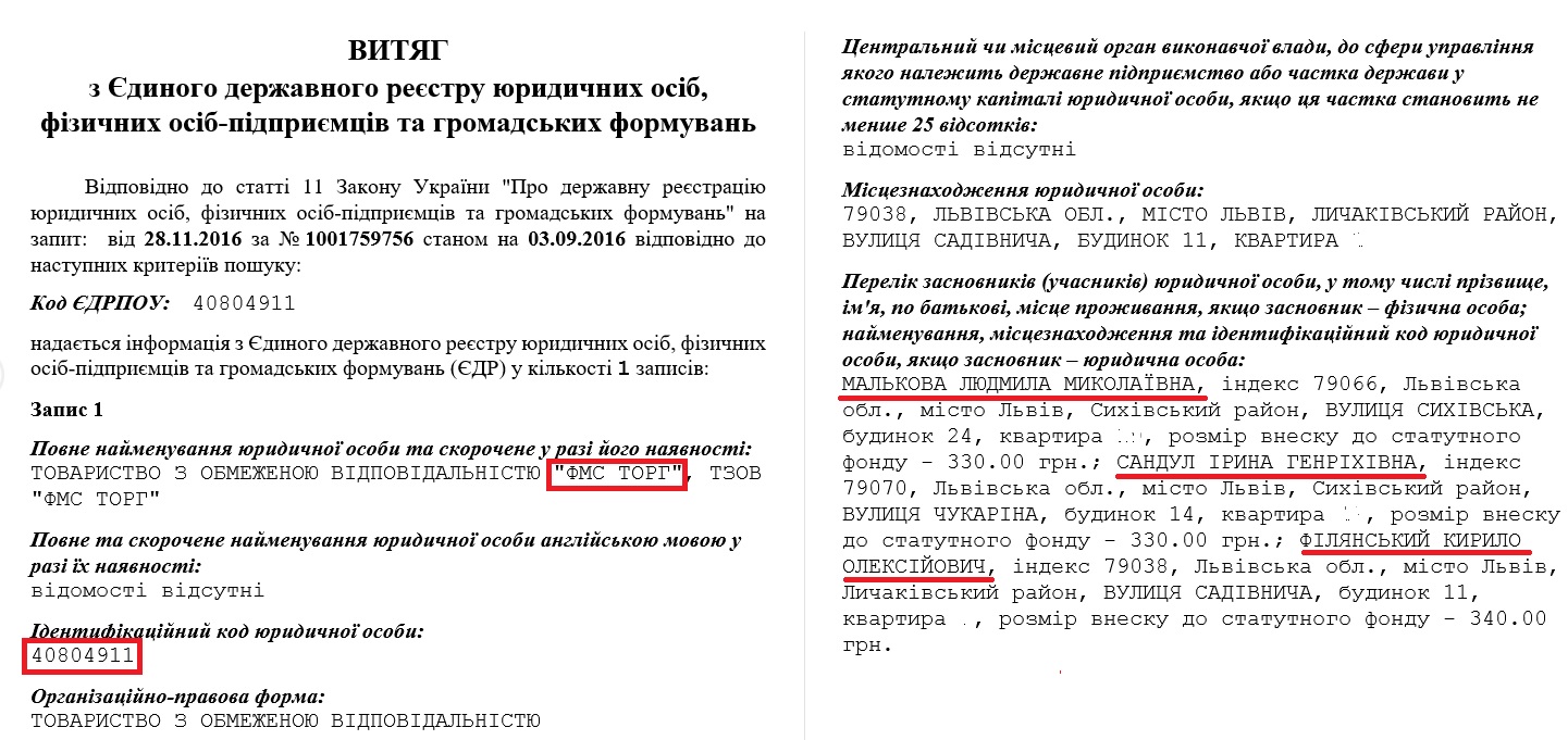 - ТОВ «ФМС ТОРГ» (3 вересня 2016), засновники Людмила Малькова, Ірина Сандул, Кирило Філянський;