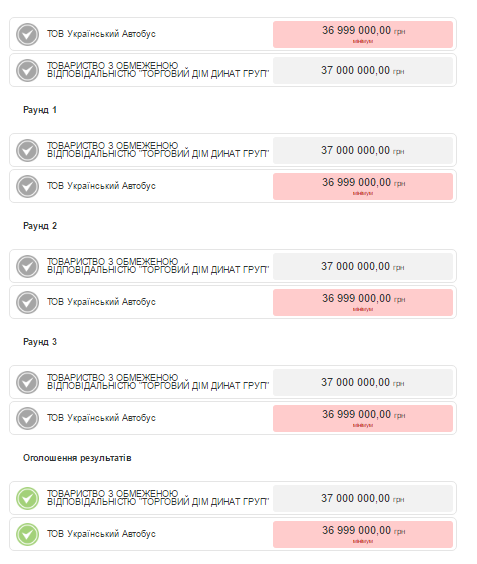 Єдиним конкурентом на торгах, виступило ТОВ «Торговий дім Динат груп», яке запропонувало ціну на 1 тис. грн більшу. Аукціон хоч і відбувався, але реальних торгів не було – учасники не знижували початкову ціну.
