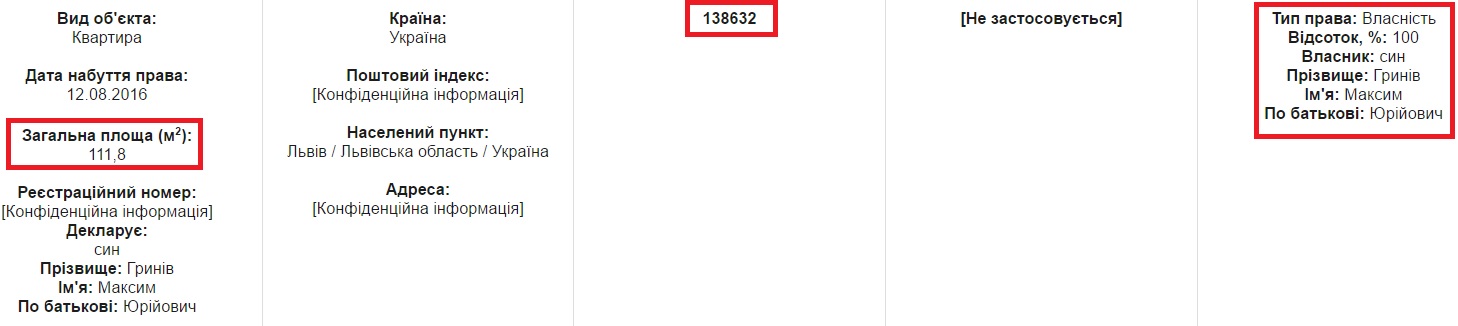 Згідно з нею, син Юрія Гриніва Максим 12 серпня цього року став власником квартири у Львові на вул. Стешенко площею 111,8 кв. м. У розділі декларації «вартість майна на дату набуття» вказано, що квартира коштує лише 138,6 тис. грн, тобто 5,6 тис. доларів (за курсом НБУ на 12 серпня). Відтак, один квадратний метр квартири обійшовся лише в 50 доларів.