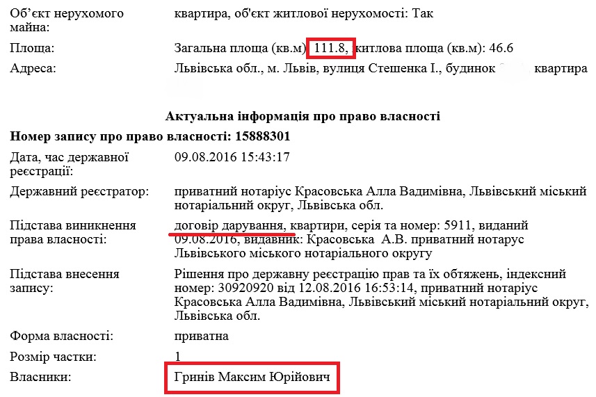 Згідно з інформацією в Державному реєстрі речових прав на нерухоме майно, Максим Гринів не купував квартиру, а отримав її за договором дарування. Ім’я дарувальника в реєстрі відсутнє.