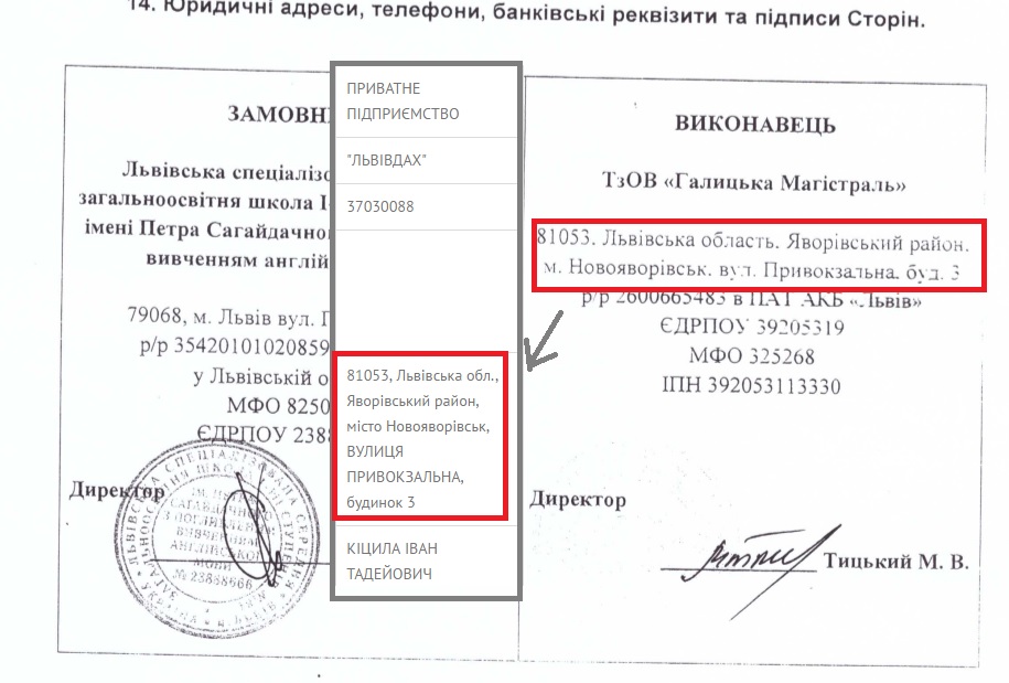 Окрім того, у договорах від червня 2015 року «Галицька магістраль» вказує наступну адресу: Новояворівськ, вул. Привокзальна, буд. 3. Такою ж є юридична адреса «Львівдаху».