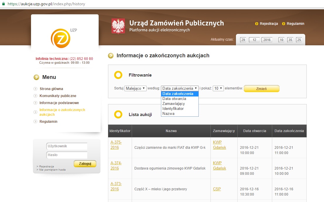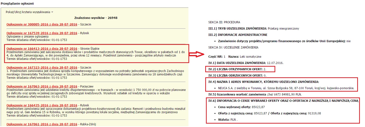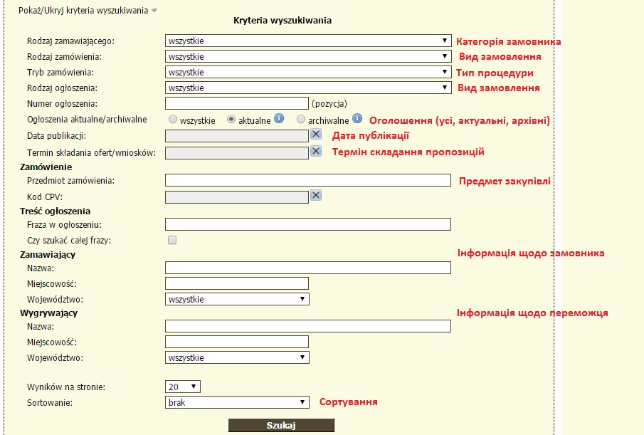Найбільш зручний пошук оголошень про проведення внутрішніх польських закупівель доступний тут. Коли торги будуть завершені, на місці оголошення підвісять інформацію щодо переможця торгів, його цінової пропозиції, а також відомості щодо найдешевшої та найдорожчої пропозицій. Проблемне місце цього реєстру у тому, що навіть при виборі так званих «архівних» оголошень, ви не обов’язково натрапите на торги з підвішеними результатами. Однак, це незамінний сайт для просіювання закупівель по оголошеннях та для прицілу на ті, де можна знайти корупцію. Чи що ви зазвичай шукаєте у подібних вісниках.