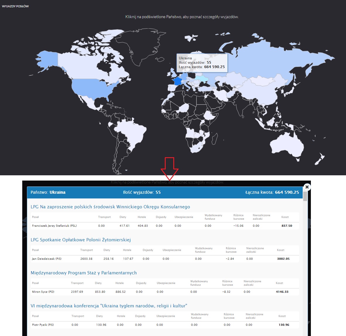 Деталізовано висвітлені видатки на закордонні подорожі депутатів з поіменним їх переліком. У 7 скликанні депутати Сейму Польщі витратили на закордонні візити більше 8 млн злотих, майже 665 тис. злотих з яких витрачені на поїздки в Україну. Загалом відбувалось 55 візитів. Росію польські депутати відвідали 24 разів, Німеччину – 43, Францію – 90.