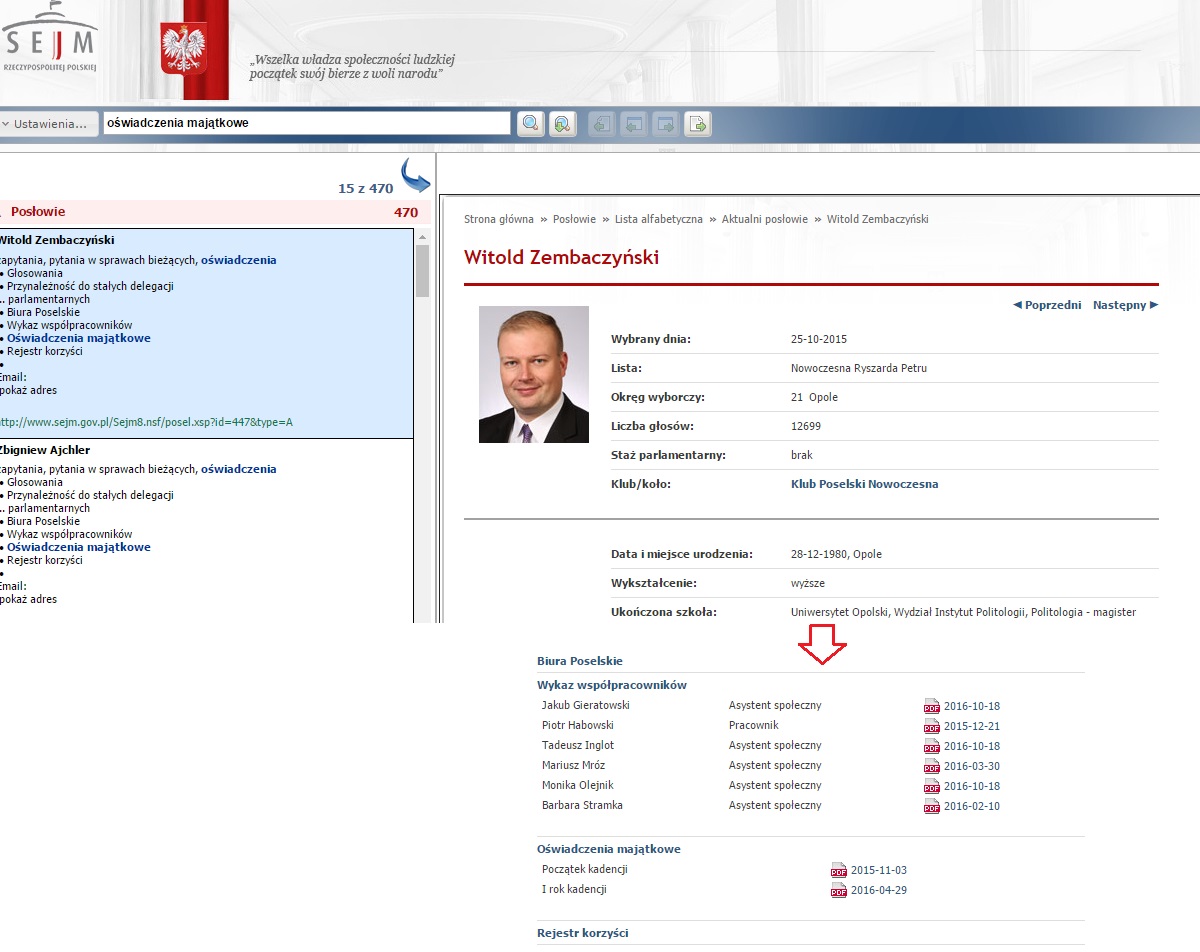 Якщо вже зайшла мова про депутатів, то декілька слів про можливість моніторингу їх діяльності та доходів/видатків. У відкритому доступі на офіційному сайті Сейму знаходяться декларації польських депутатів. Тут же можна ознайомитись з біографією депутата, його активністю та роботою, переглянути помічників, перевірити, чи не отримує раптом обранець населення неправомірної вигоди, представляючи їхні інтереси.