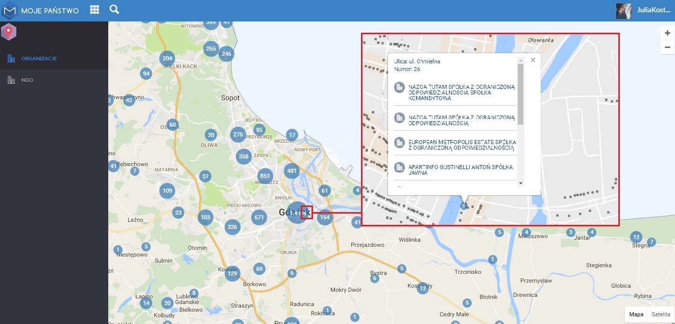 На порталі є також розділ «Мапа» (Mapa), де можна дізнатись, яка кількість фірм та організацій зареєстровані за однією адресою. Клік на одне «кубло» відкриває вікно з переліком зареєстрованих у конкретному будинку юросіб, інформація по кожній з яких уже внесена в реєстр організацій – таким чином, другий клік виведе вас на власника фірми. Це ще не автоматизований пошук пов’язаних осіб як український «Youcontrol», але непогана підказка у створенні карти «знайомих» фірм.
