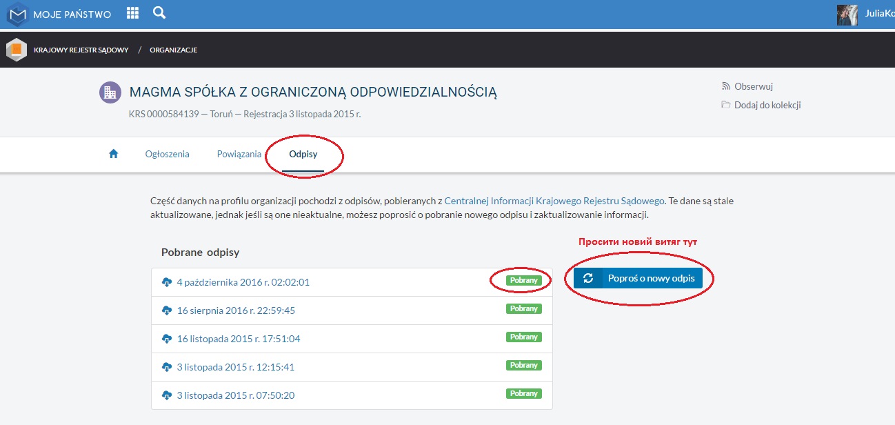 Реєстр також підтягує актуальні витяги з держреєстру для зареєстрованих користувачів (благо, реєстрація спрощена до мінімуму і займає дві хвилини). На картці фірми справи буде розміщено допис «Pobirz aktualny odpis z KRS». За лінком вас очікуватиме ряд витягів на конкретну дату (їхня кількість залежить від популярності фірми у запитувачів інформації), які можна завантажити. Є опція «попросити новий витяг». Свіжий витяг по одній з фірм автор цих рядків отримала упродовж 10 хвилин.