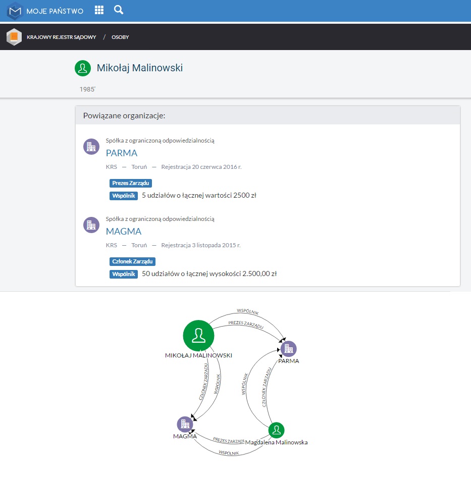 Повернемось до випадково обраної фірми «Magma» і спробуємо знайти її у реєстрі організацій на порталі «MojePanstwo» (для пошуку особи перейдіть у гілку «Osoby»).