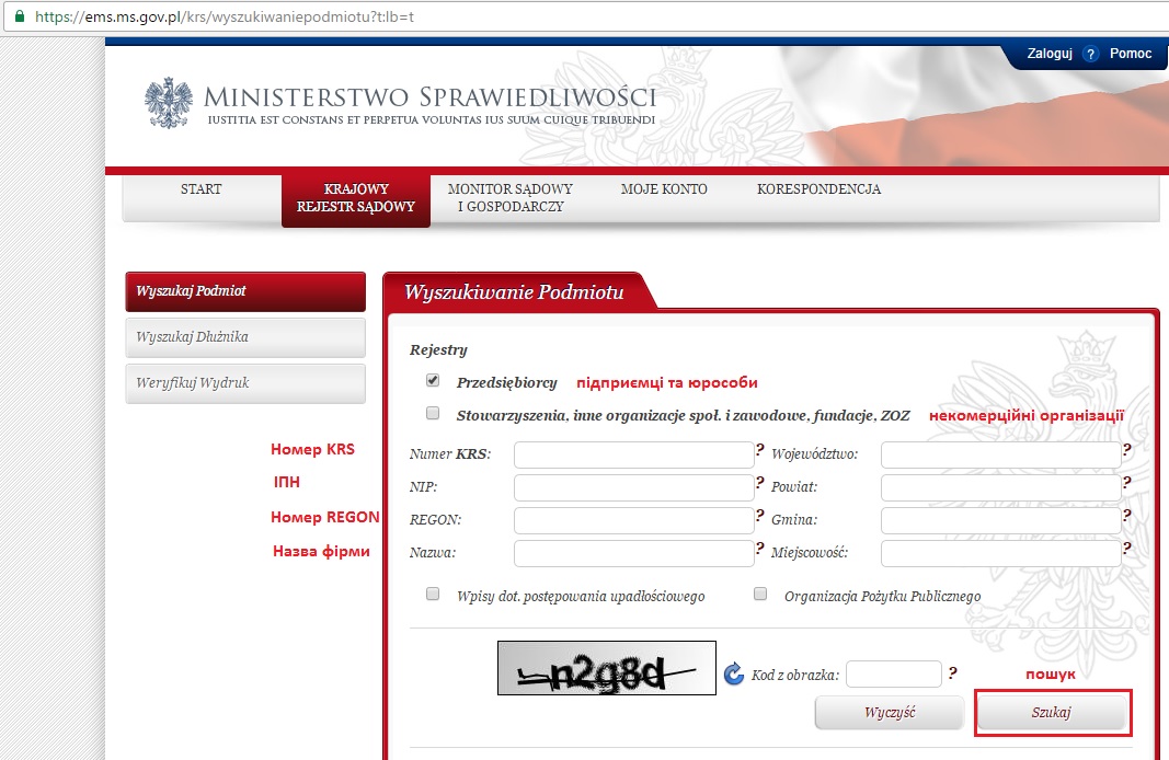Зупинимося на реєстрі підприємців та юридичних осіб. Пошук у ньому можна здійснювати за кількома критеріями, серед яких – реєстраційний номер у держреєстрі підприємств Польщі (Numer KRS), ідентифікаційний податковий номер (NIP), номер у реєстрі Центрального статистичного управління Польщі (REGON) та назва фірми.