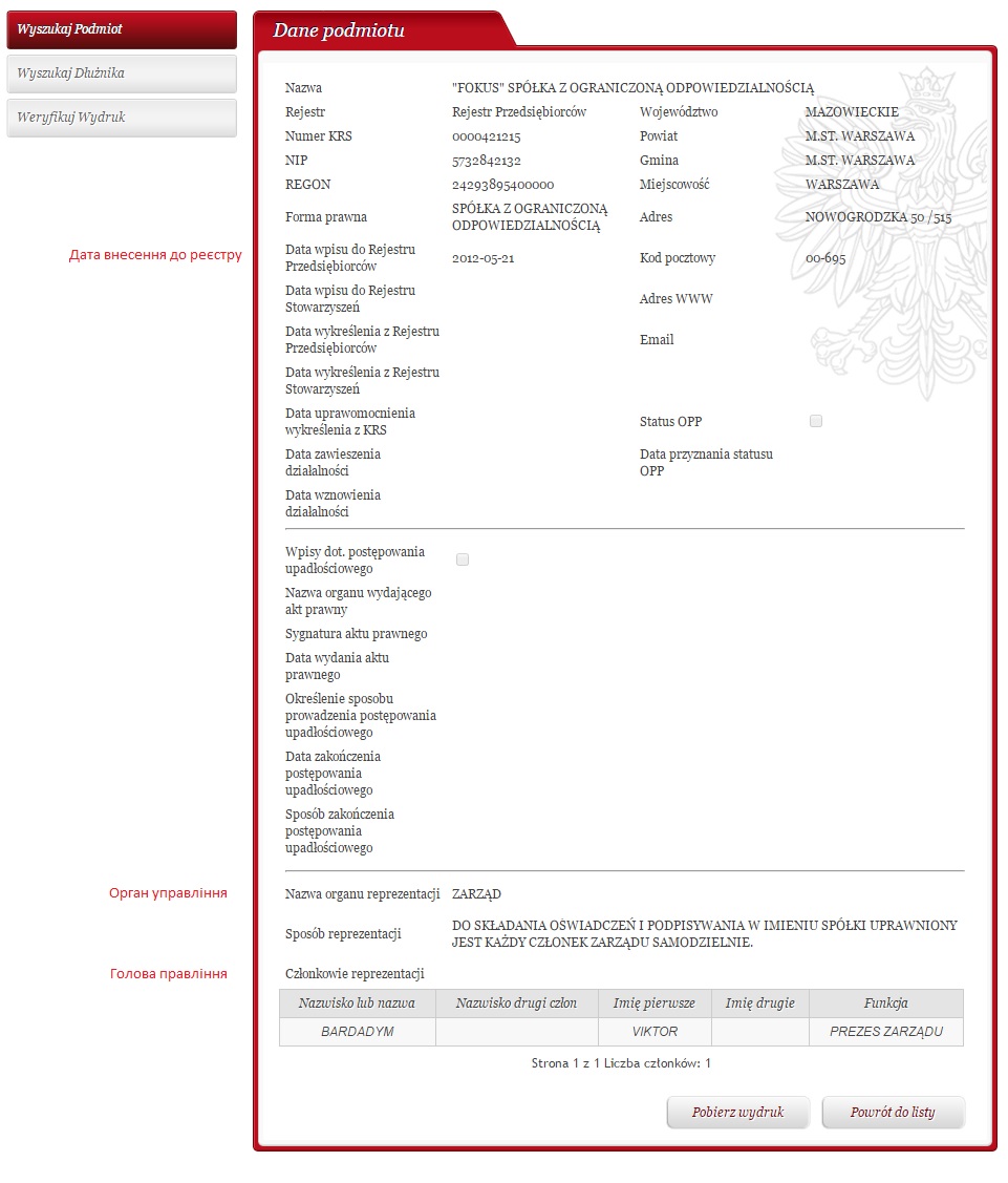 Найбільш точним є пошук за кодами. Якщо критерієм для пошуку була назва фірми, доведеться докласти зусиль, аби ідентифікувати бажану. У цьому плані – нічого нового. На виході отримаєте інформацію щодо повної назви фірми, її місцезнаходження, дату заснування, представників органу правління фірми. Якщо пощастить, у картці будуть вказані також контактні дані підприємця чи юрособи. Для більш повної картинки тисніть «Pobierz wydruk» на «дні» сторінки.