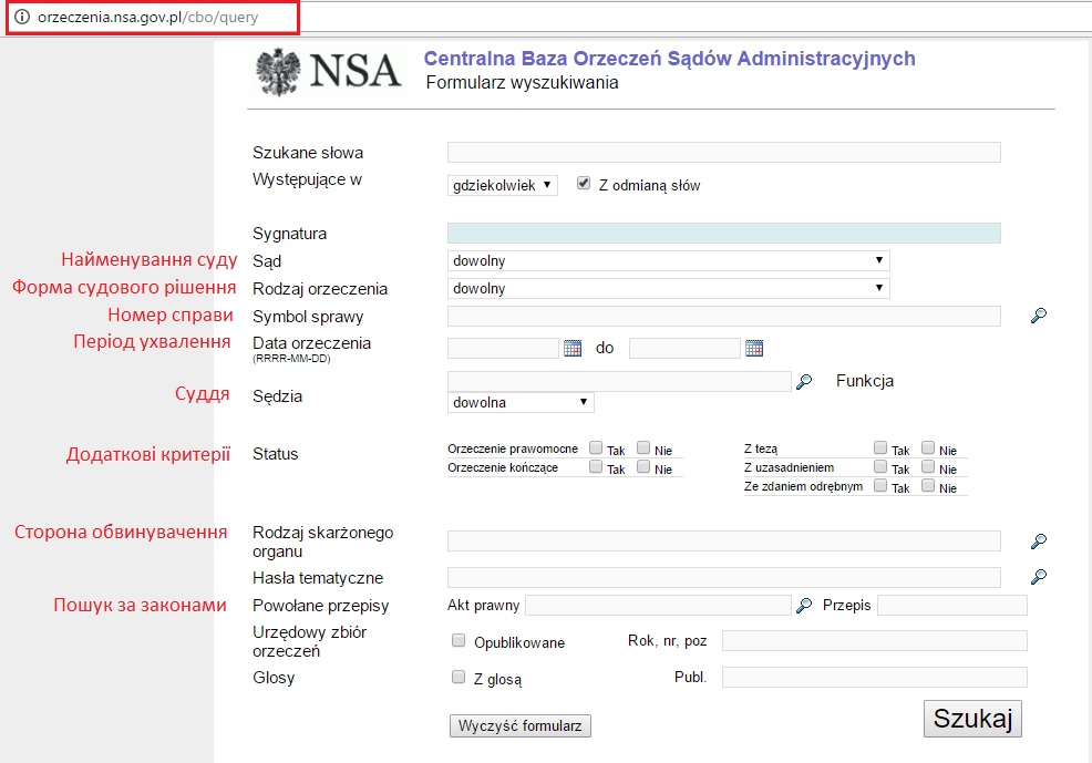 Серед критеріїв пошуку у центральній базі рішень адмінсудів є номер справи, найменування суду, форма судового рішення (вирок, постанова, ухвала). Можна також зробити вибірку висновків за певний період часу та рядом інших додаткових критеріїв.