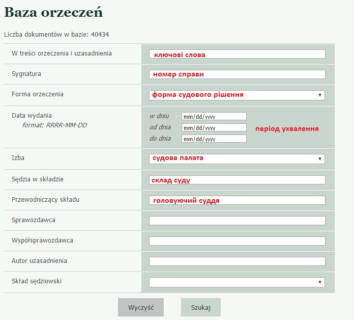 Здійснювати пошук судових висновків можна за ключовими словами, номером справи. Також можна задати параметри часу, відфільтрувати рішення у відповідності до судді, який розглядав справу, суду або палати суду (з розгляду цивільних, кримінальних, господарських, трудових, родинних тощо справ).
