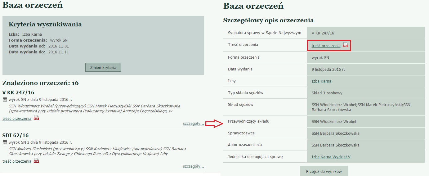 Видані результати пошуку відсортовані за спаданням і кожен з висновків доступний до детального перегляду. Для цього клікайте на «treść orzeczenia».