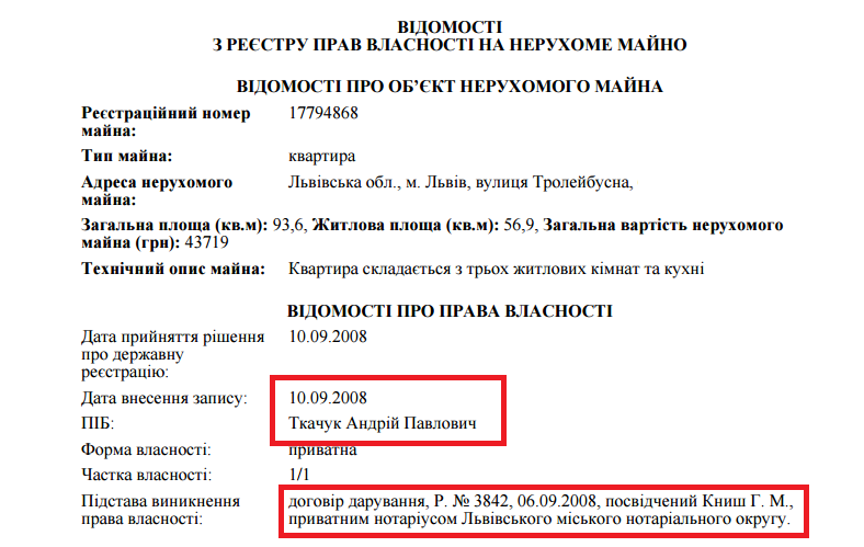 Це відповідає дійсності, оскільки, згідно з Державним реєстром речових прав на нерухоме майно, Олена Сапіга у жовтні 2008 року подарувала квартиру на вулиці Тролейбусній своєму рідному братові Андрієві Ткачуку, сину генерала Ткачука, який на даний час працює військовим аташе в посольстві України в Австрії.
