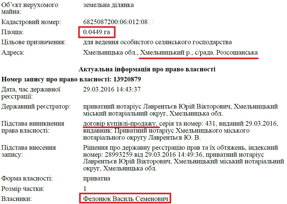Так, 29 березня 2016 року Василь Фелонюк придбав ділянку площею 0,0449 га для ведення особистого селянського господарства на березі водойми на території Розсошанської сільради, що фактично межує з містом Хмельницький.