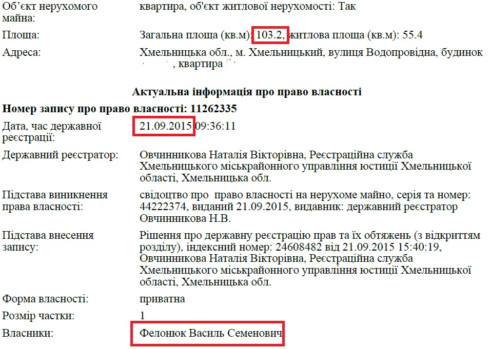 Згідно з реєстром нерухомості, також у 2015 році Василь Фелонюк оформив право власності на квартиру площею понад 100 кв. м у Хмельницькому.