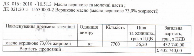 Вартість одного кілограма замовленого масла становитиме 56,2 грн. Водночас, як свідчать ціни на ринку «Шувар», масло жирністю 72,5 % коштує щонайменше 115 грн. За 43,7 грн/кг можна придбати спред.