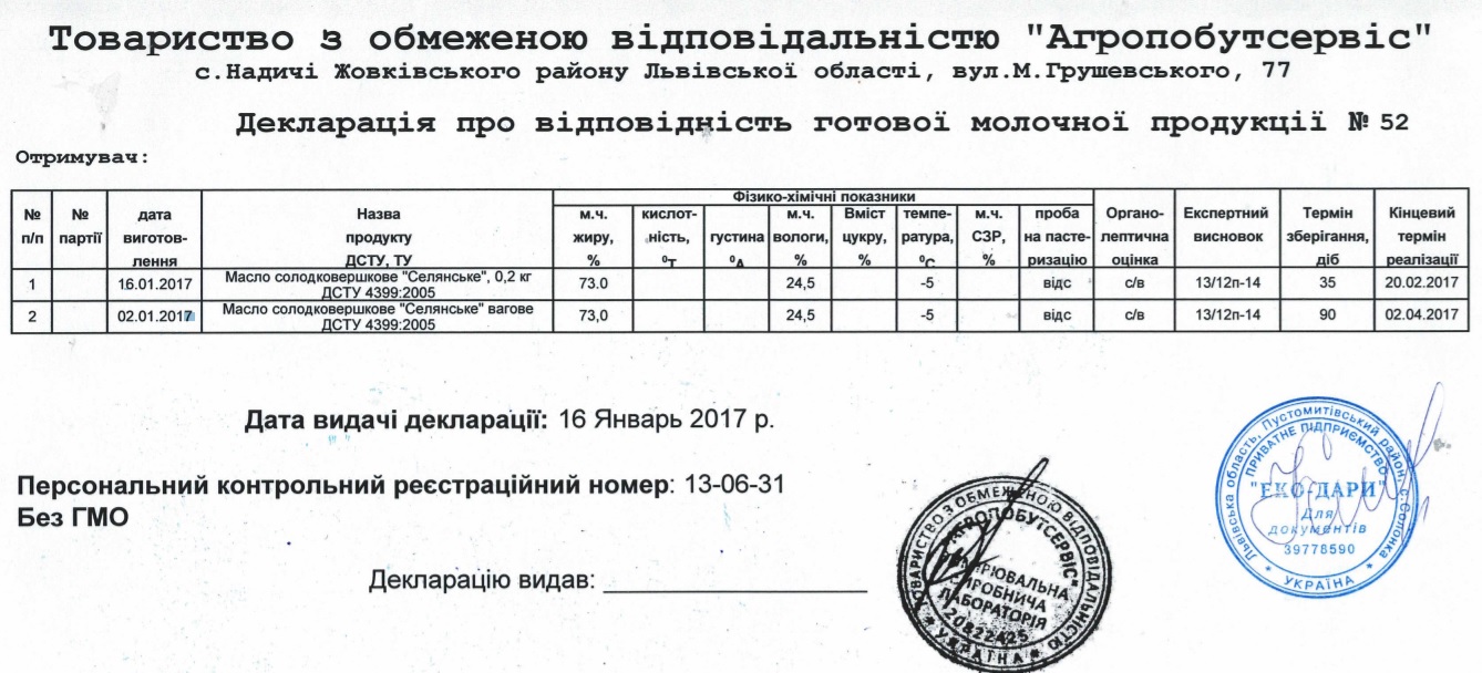 В оприлюднених на Prozorro документах ПП «Еко-дари» повідомило, що постачатиме масло виробника з Львівської області – ТОВ «Агропобутсервіс». Також вони надали копію декларації про відповідність молочної продукції – вершкове масло жирністю 73%, яке відповідає ДСТУ 4399:2005, виготовлене 2 та 16 січня 2017 року.