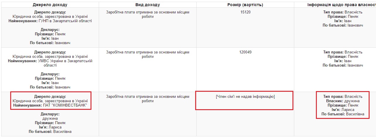Доходи Лариси Пеняк поліцейський приховав і у 2014-му, і у 2015-му деклараційних роках. З е-декларації відомо лише, що у 2015 році жінка поліцейського працювала у ПАТ «Комінвестбанк». Сам Пеняк у 2014-2015 роках заробив сумарно 256 тис. грн доходу.