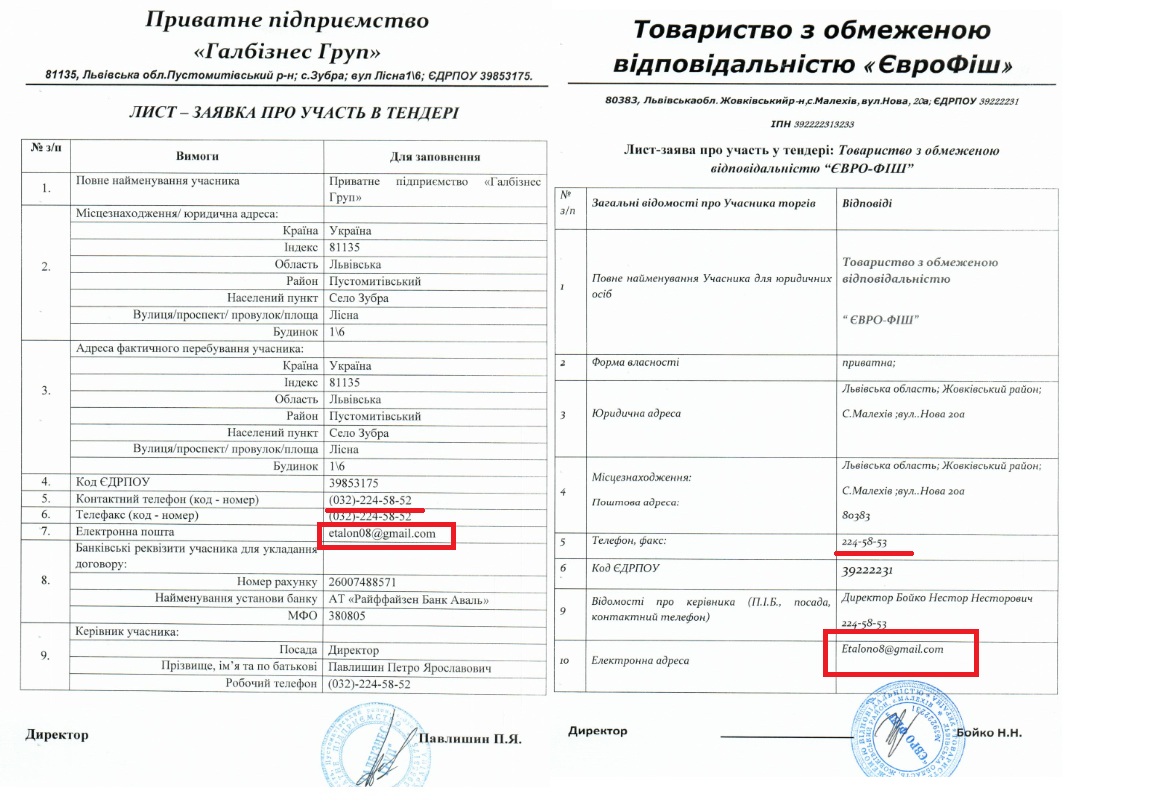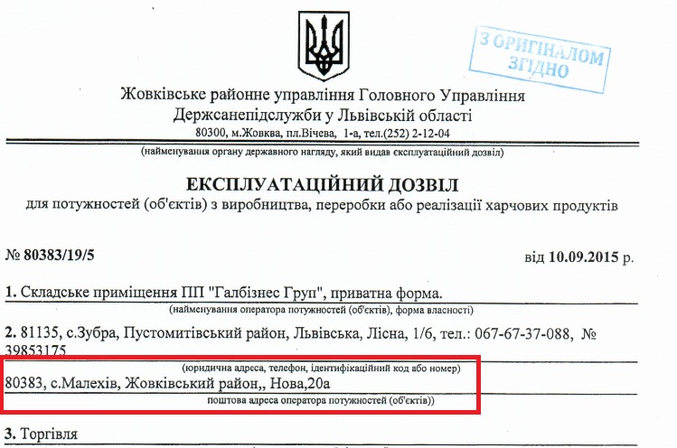“Євро Фіш” зареєстрована в Малехові, на вул. Нова, 20а. Такою ж є поштова адреса “Галбізнес Груп”, свідчить експлуатаційний дозвіл, який фірма оприлюднила в Prozorro.