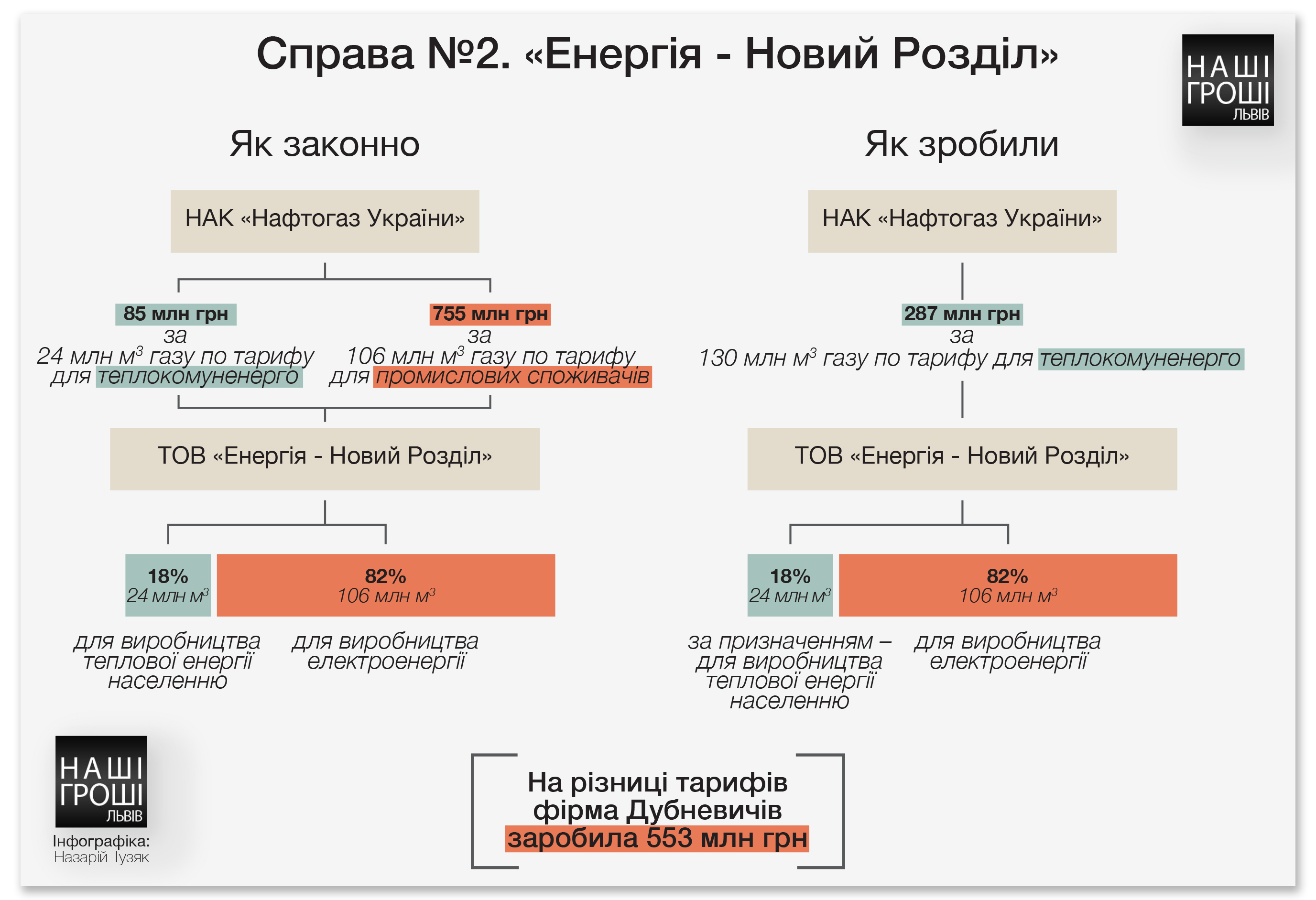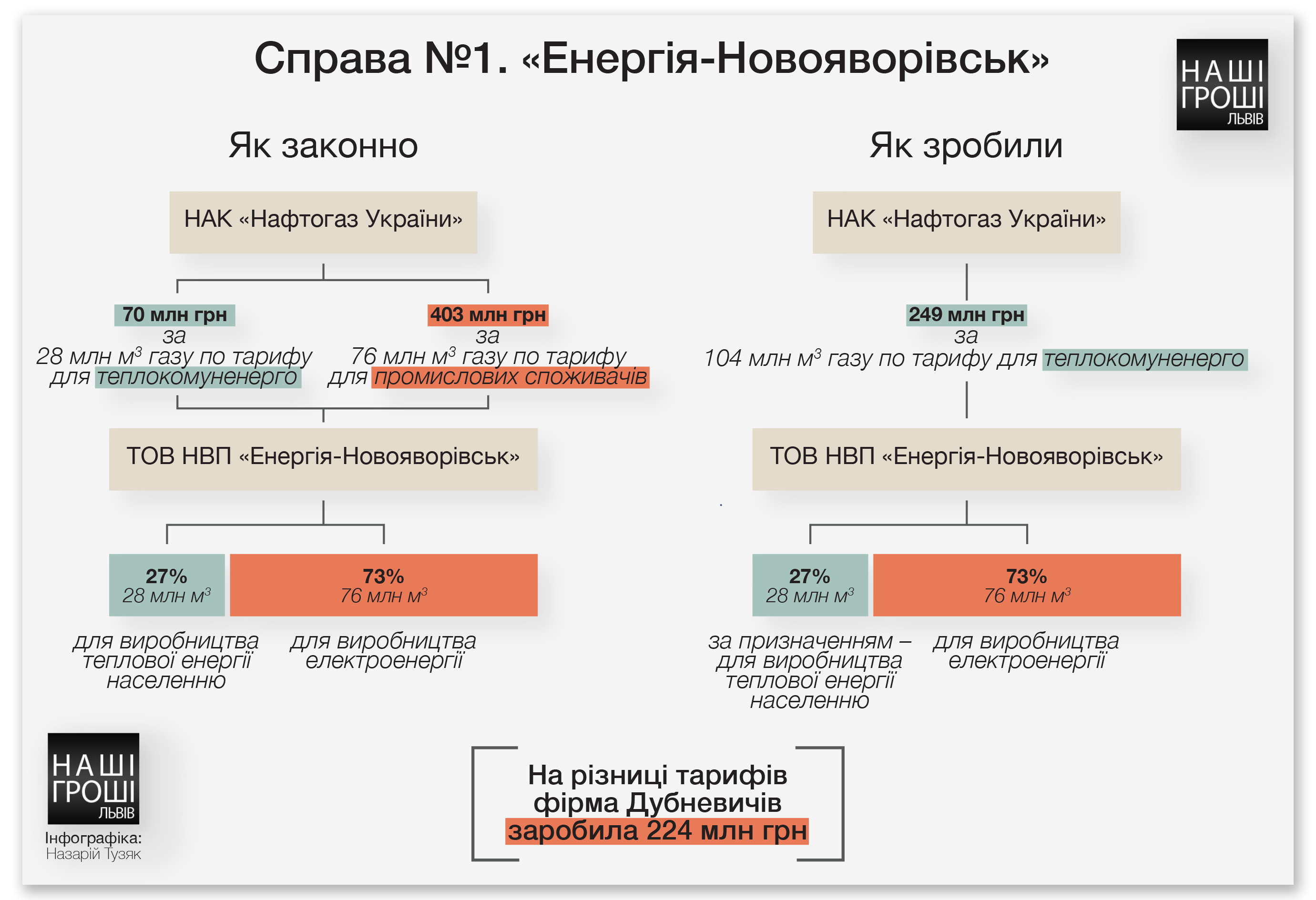 Вперше оборудку з пільговим газом виявили на ТОВ НВП «Енергія-Новояворівськ». Зловживання зафіксували аудитори відділу Національної комісії, що здійснює державне регулювання у сферах енергетики та комунальних послуг (НКРЕКП) у Львівській області в квітні 2016 року під час позапланової перевірки діяльності цього підприємства.