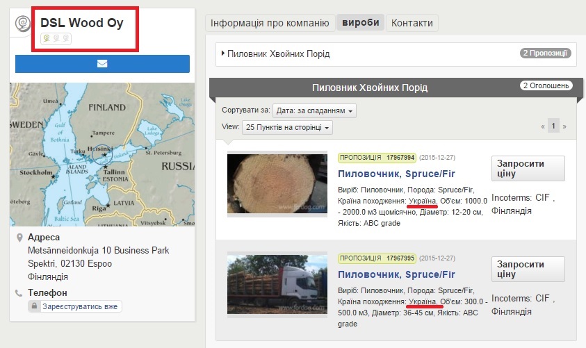 Інший співвласник української фірми «ДСЛ Вуд Юкрейн» - фінська «DSL Wood Oy» аж ніяк не виглядає як потужна компанія. З відкритих джерел ми дізнались, що в «DSL Wood Oy» працювало лише двоє людей. Ні філіалів, ні дочірніх підприємств.