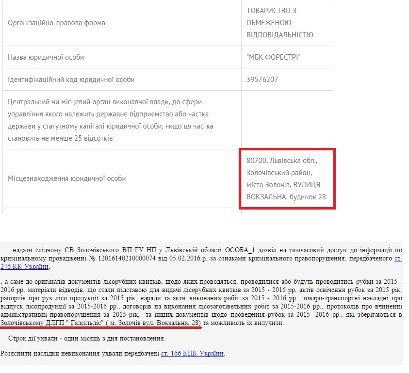 Ще нещодавна «МБК «Форестрі» була зареєстрована у Золочеві на вулиці Вокзальний, 28. Водночас це адреса Золочівського дочірнього підприємства «Галсільлісу».