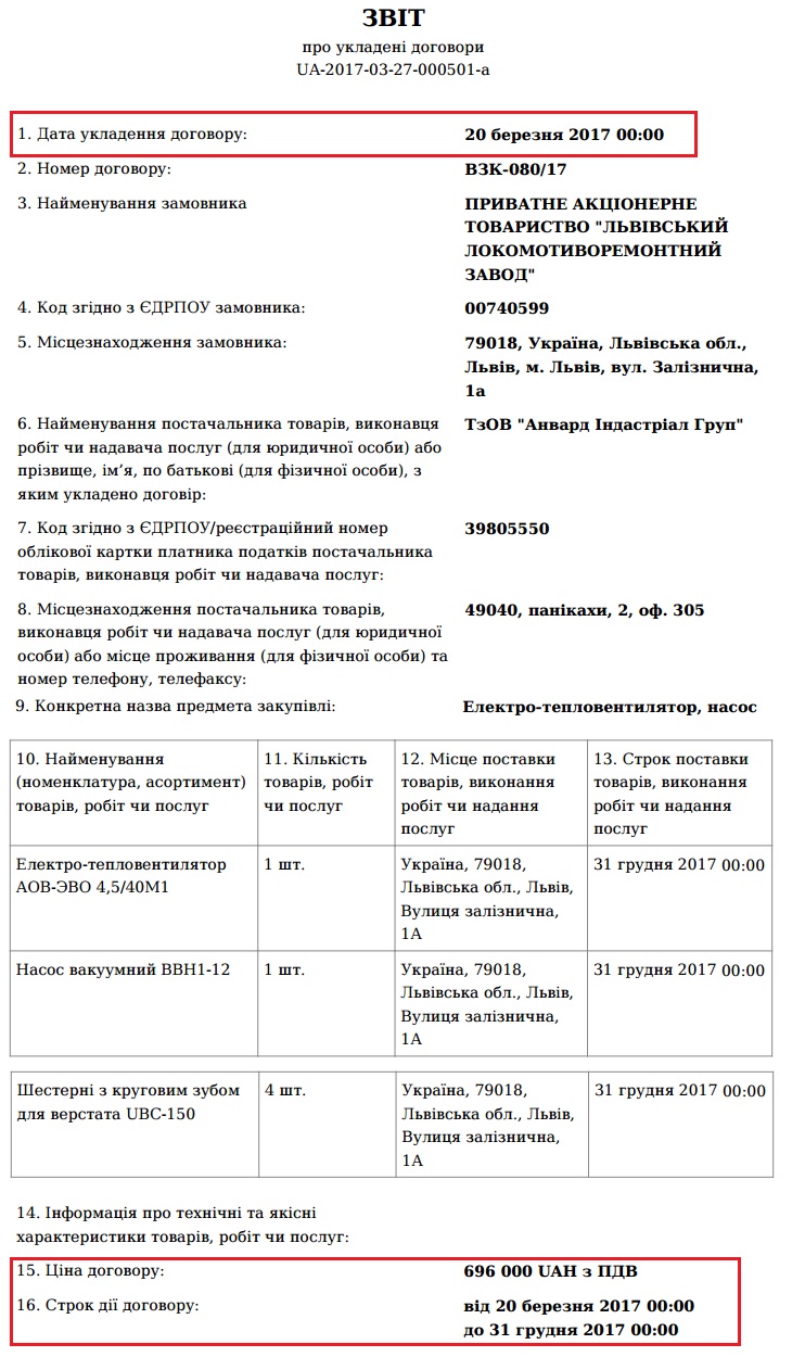Так, завод планував придбати електро-тепловентилятор АОВ-ЭВО 4,5/40М1 за 169 тис. грн при його ринковій ціні – 6,7 тис. грн, насос вакуумний ВВН1-12 за 67 тис. грн, тоді як його можна купити за 23,5 тис. грн, та 4 шестерні з круговим зубом для верстата UBC-150 за 344 тис. грн. Сумарна вартість закупівлі, прописана у договорі, становила 696 тис. грн, очікувана – 700 тис. грн.