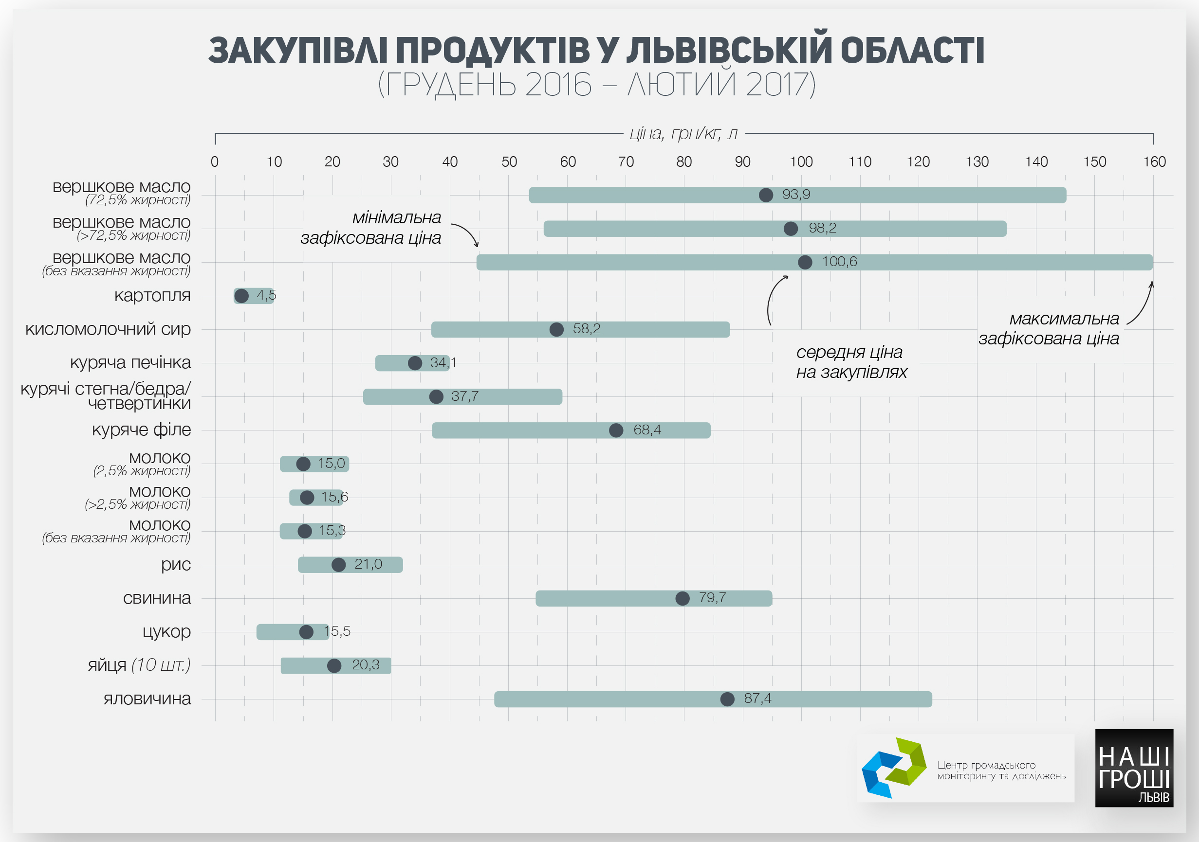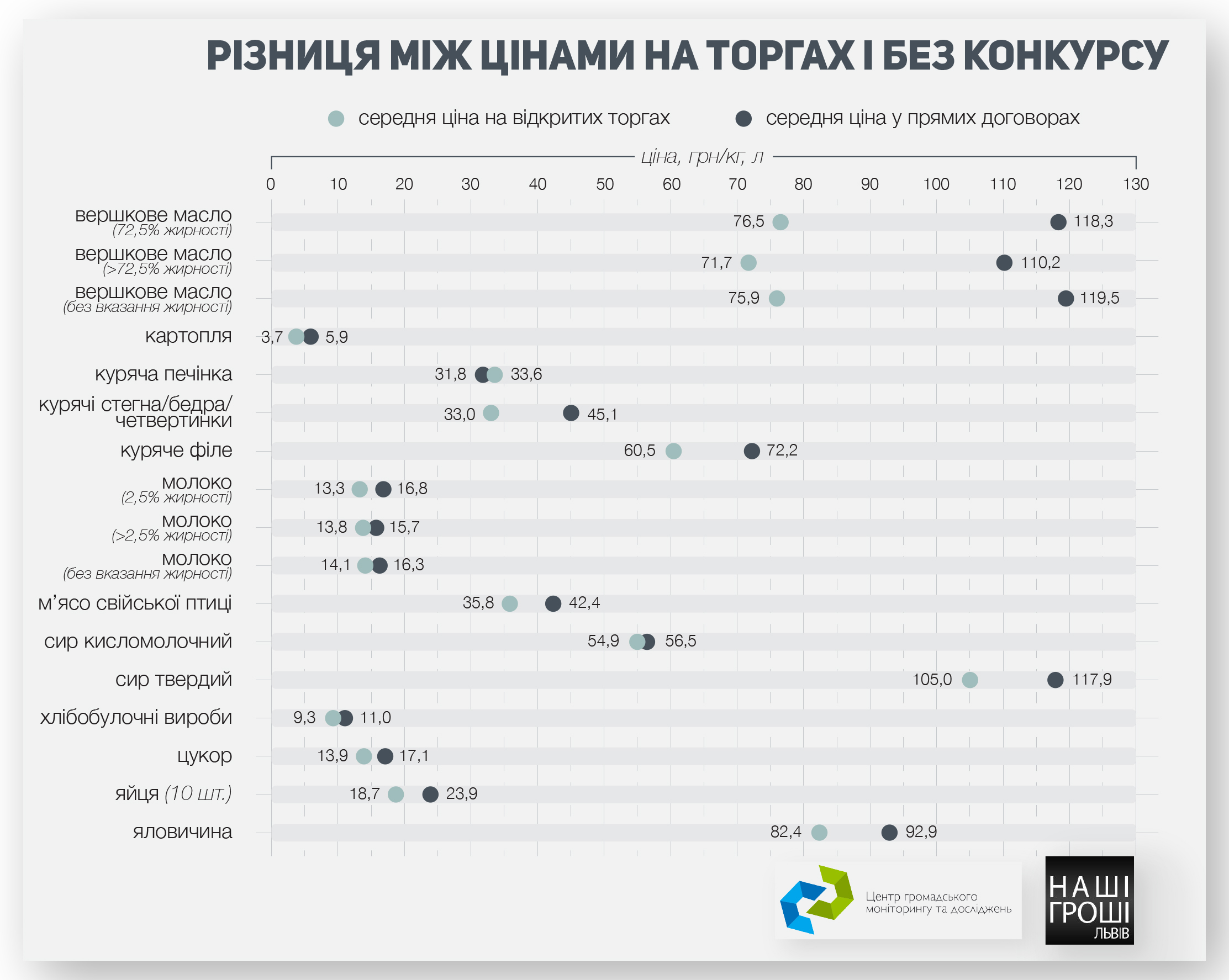 Різні замовники у Львівській області купують одні й ті самі продукти зі значною різницею. Часто ця різниця становить 200-300%. Наприклад, в укладених договорах ціна на кіло вершкового масла жирністю 72,5% коливається від 53,5 грн до 145,2 грн.