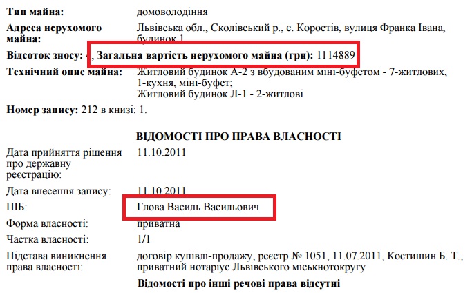 Назва фірми ТОВ “Соколине гніздо” з готельним видом діяльності співпадає з назвою міні-готелю в Коростові Львівської області, що за 18 км від Славське. Згідно з реєстром нерухомості, за цією ж адресою Василь Глова у 2011 році став власником будинку з вбудованим міні-буфетом. На той момент загальна вартість нерухомості становила 1,1 млн грн, вказано в реєстрі. Площа будинку не зазначена, однак в його е-декларації вказано, що майно має 434,7 “квадратів”. У тому ж селі Василь Глова володіє незавершеним будівництвом площею 850 кв. м.