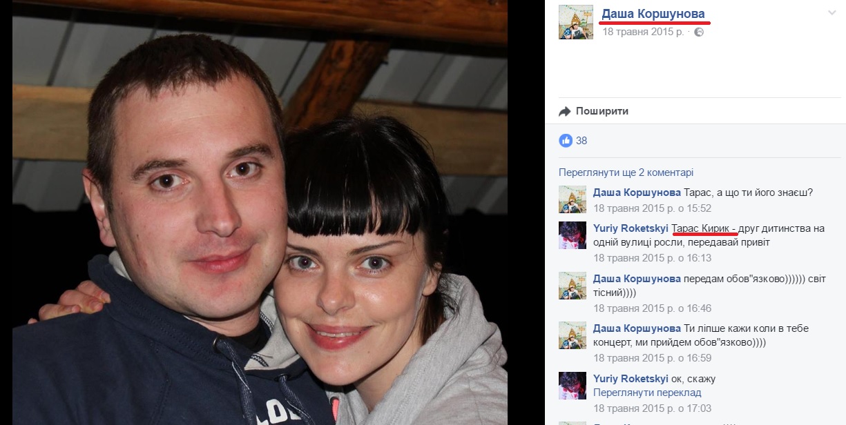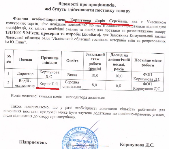 При реєстрації приватним підприємцем Тарас Кирик вказав номер мобільного телефону (0967900100), який Дарія Коршунова використала при реєстрації в соціальній мережі Facebook. З її профілю стало відомо, що вони одружені. На попередніх торгах Дарія Коршунова вказувала, що Кирик працює в неї водієм-експедитором. Так само її фірма, ПП «Перша торгова компанія», надавала Тарасу Кирику позитивні відгуки про виконання аналогічних договорів для участі в держзакупівлях.