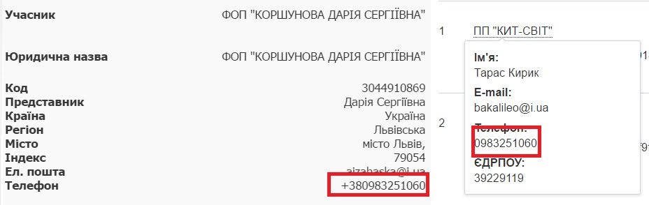 Окрім того, мобільний номер телефону, який вказує Дарія Коршунова (0983251060), також використовує Тарас Кирик при представництві на торгах фірми, де він є співвласником (ПП «Кит-Світ»).