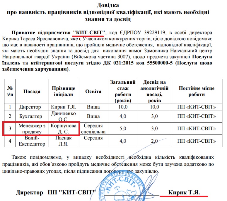 Також підприємство «Кит-Світ» вказує, що Коршунова працює на фірмі на посаді менеджера з продажу.
