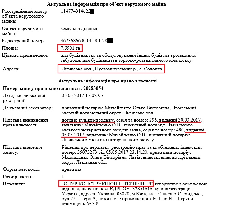 Разом з тим, з реєстру речових прав на нерухоме майно відомо, що ТОВ «Онур конструкціон інтернешнл» 5 травня зареєструвало право власності на земельну ділянку під Львовом загальною площею 7,59 га.