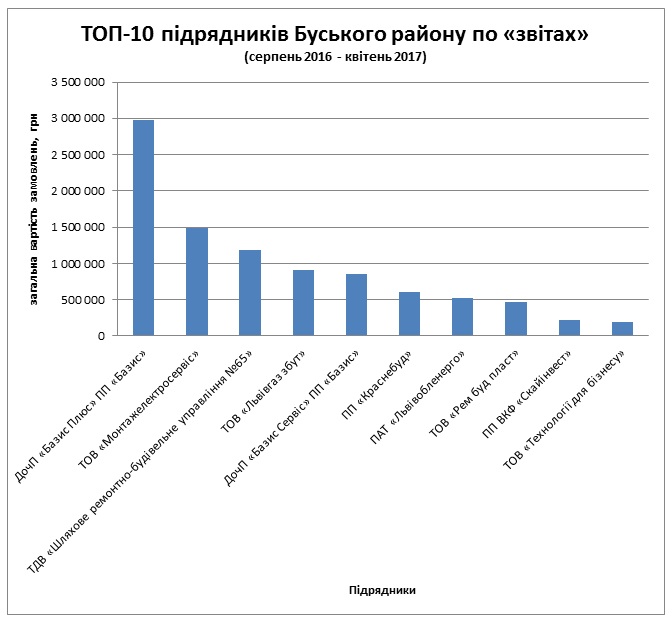 У переліку фірм, що увійшли в топ-10 підрядників за процедурою звітування, дочірні фірми ПП «Базис» – «Базис Сервіс» та «Базис плюс». Керівником обох «дочок» є Василь Стаднюк, колишній заступник голови Кам’янка-Бузької РДА, висуванець від «КУН» до Кам’янка-Бузької райради на місцевих виборах 2015 року.