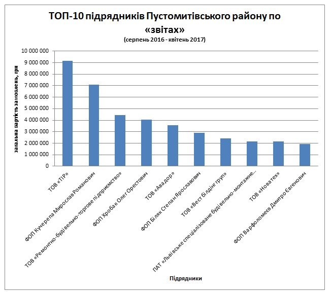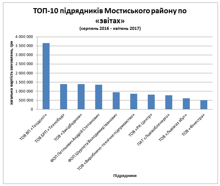У період часу з серпня 2016 по квітень 2017 року бюджетники Мостиського району замовили товарів, робіт та послуг на загальну суму 44,67 млн грн. З них понад 40% розподілили через звіти. Найбільше коштів тут отримала фірма пустомитівських підприємців – будівельне ТОВ ВП «Теодоліт» зареєстроване на Геннадія Опоку, Оксану Хомин і Ігоря Гоїна. За підсумком 2016 року фірма отримала у Мостиському районі 8 замовлень на загальну суму 1,22 млн грн, а з початку 2017 року зібрала замовлень вже на 2,58 млн грн.