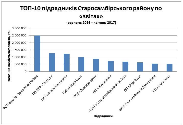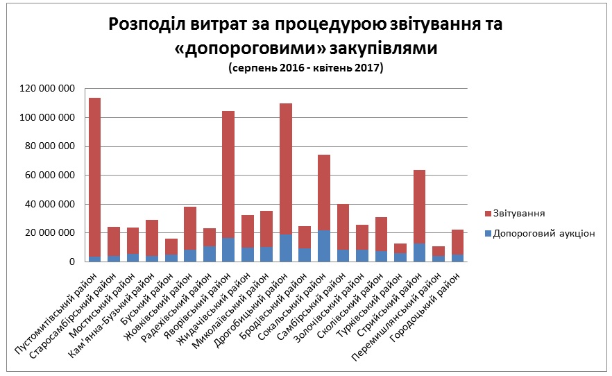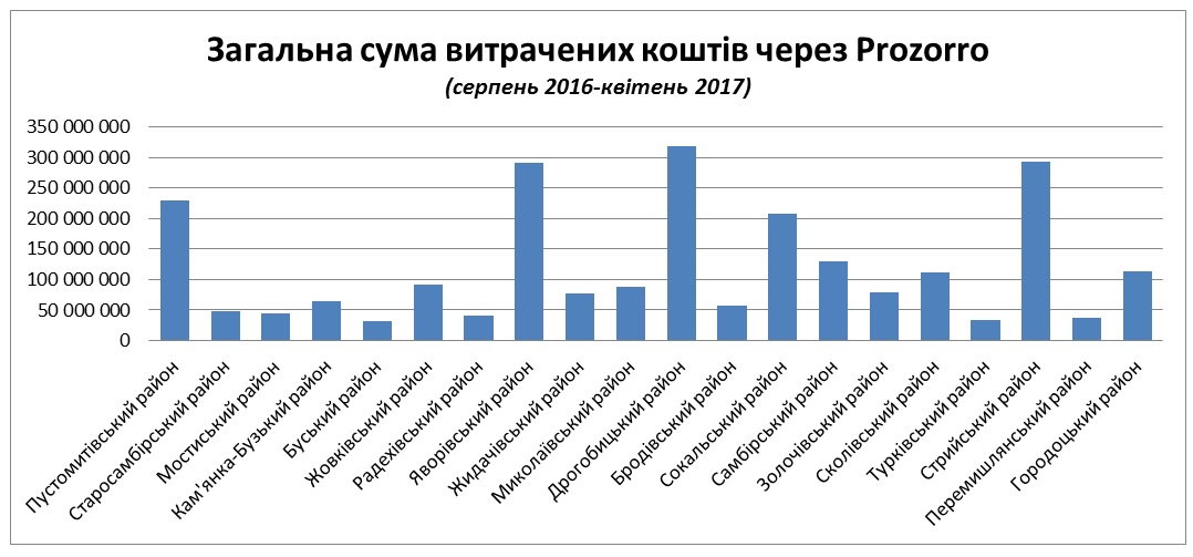 Згідно з даними Prozorro, протягом серпня 2016 – квітня 2017, бюджетники Львівської області витратили на товари, роботи та послуги 2,38 млрд грн. З них 674,91 млн грн освоєні за процедурою звітування про укладений договір.