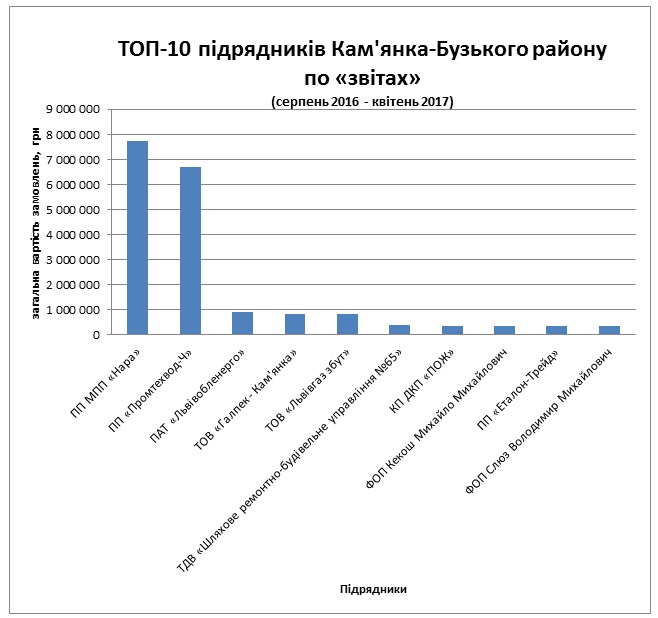 Найбільш активними учасниками розподілу місцевого бюджету є дві фірми – МПП «Нара» Самвела Аветісяна (7,72 млн грн) та ПП «Промтехвод-Ч» Миколи Чепіля (6,71 млн грн). Останній на місцевих виборах 2015 безуспішно намагався стати депутатом Кам’янка-Бузької райради від БПП.