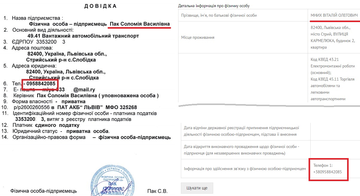 При реєстрації підприємцем Віталій Мних вказав номер мобільного телефону (+380958842085), який використала при реєстрації в соцмережі Facebook 25-річна донька директора Стрийського міського комбінату комунальних підприємств Василя Васьковича Соломія, яка нині має прізвище Пак.